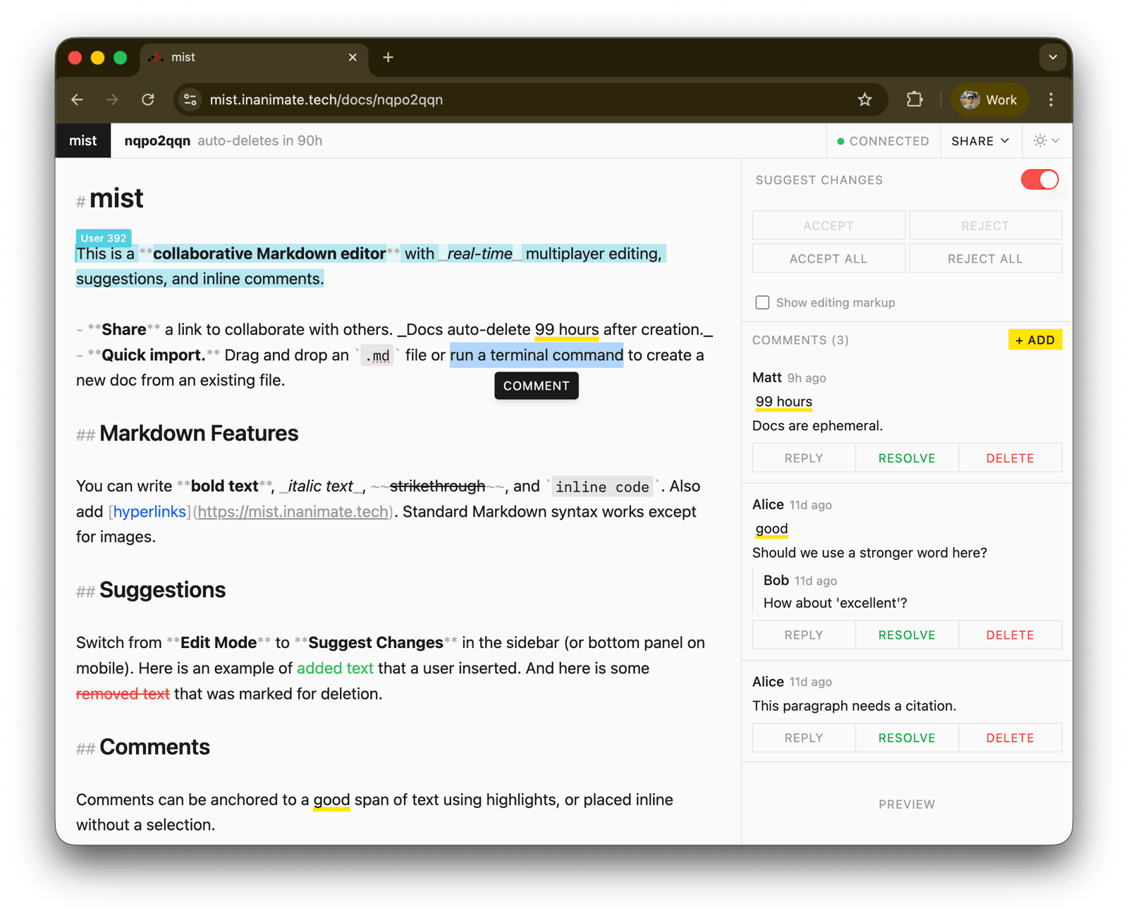 I want to be able to share a Markdown doc as easily as sharing a link, and have real-time multiplayer editing, suggested edits, and comments, without a heavyweight app in the background.