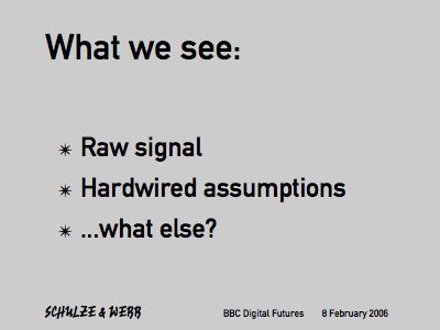 So far I’ve said that what we see is composed of more than the raw perception signal. Hardwired deductions, which I’ve called ‘assumptions’ are there too. To us, these deductions are just as “real” as the signal itself.