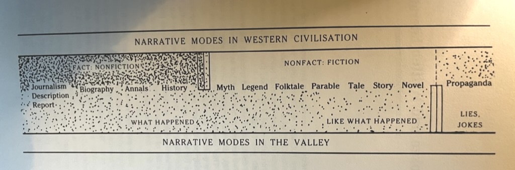 - we bucket stories of types like journalism and history as “fact” and types like legend and novels as “fiction,” this binary division