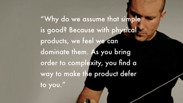 "Why do we assume that simple is good? Because with physical products, we feel we can dominate them. As you bring order to complexity, you find a way to make the product defer to you."