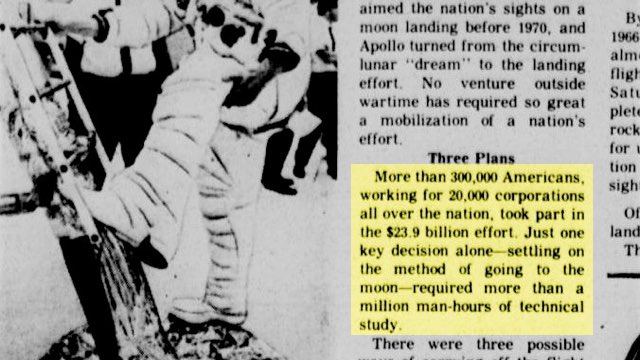 "More than 300,000 Americans, working for 20,000 corporations all over the nation, took part in the $23.9 billion effort. Just one key decision alone - settling on the method of going to the moon - required more than a million man-hours of technical study."